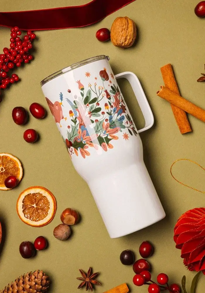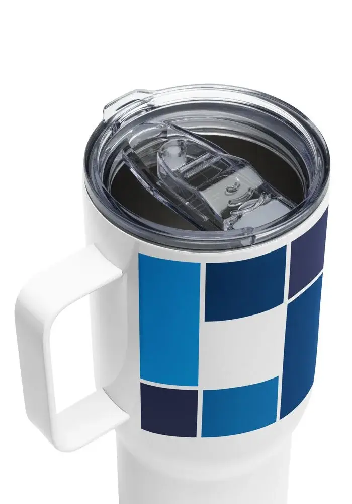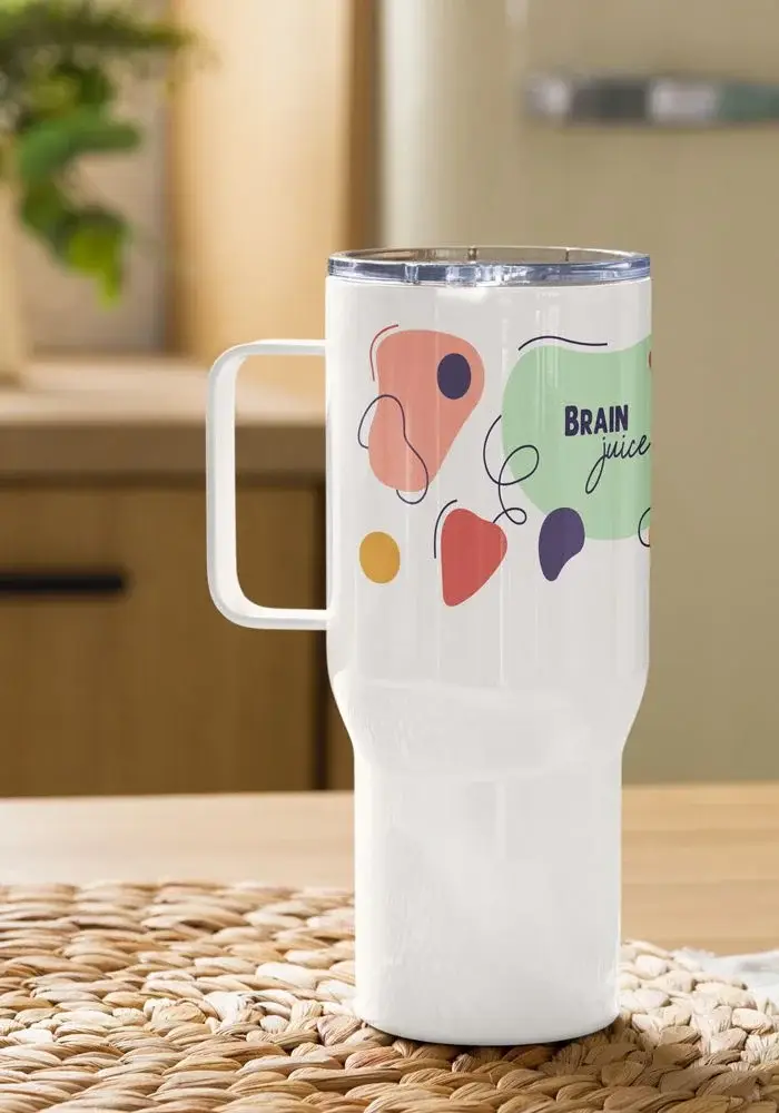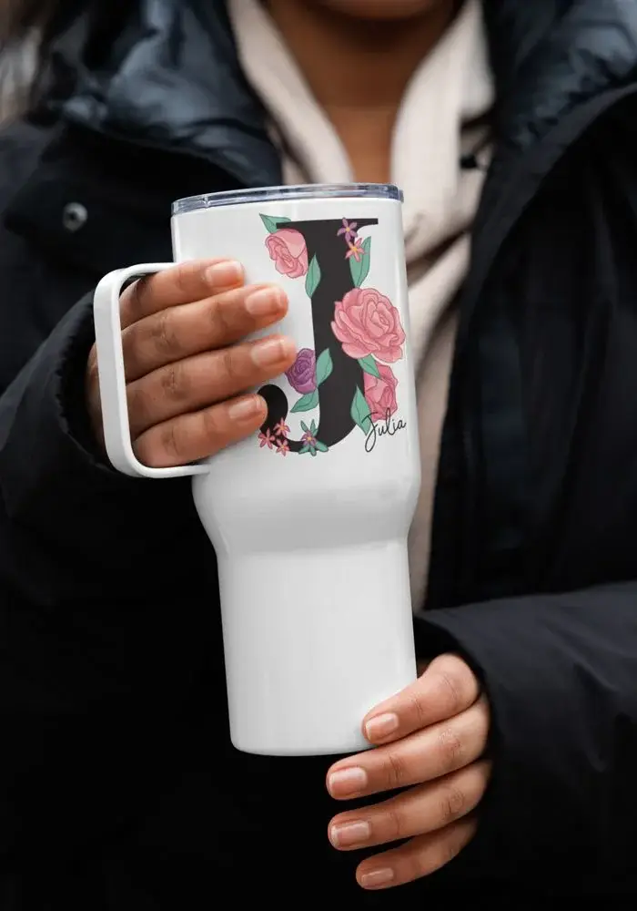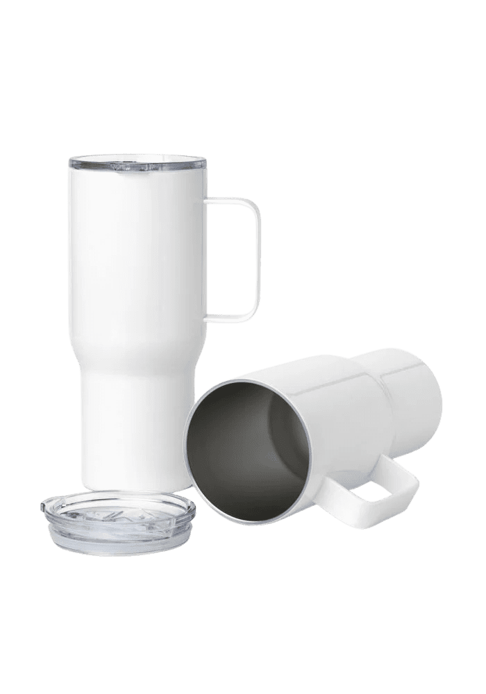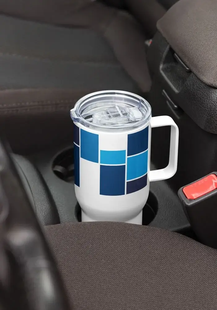 Enjoy your favorite beverage on the go with a premium-quality travel mug. It’s made with stainless steel and keeps hot drinks hot for up to 6 h, and cold drinks cold for up to 8 h. It fits into most car cup holders and has a spill-proof plastic lid. Personalize it for yourself or add it to your online store and start selling modern drinkware.